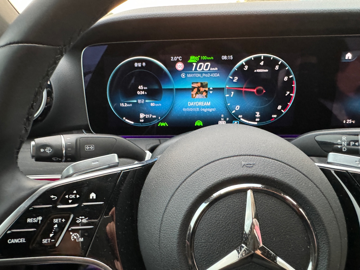바로 위에 스티어링 힐 왼쪽에 보시면 RES/ 를 눌러서 크루즈 컨트롤을 활성화시켰습니다. 속도는 현재 달리고 있는 속도로 자동 세팅이 됩니다.