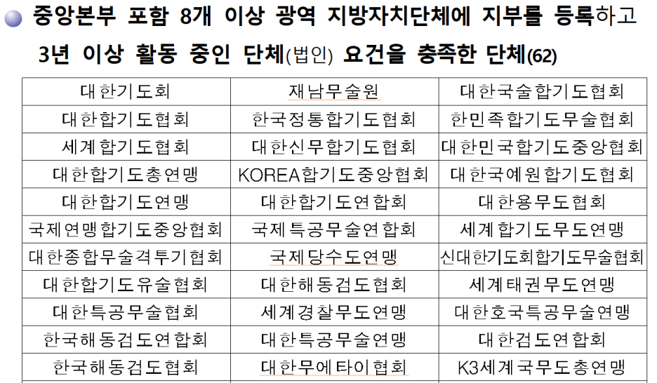 대한기도회, 대한합기도협회, 세계합기도협회, 대한합기도총연맹, 대한합기도연맹, 국제연맹합기도중앙협회, 대한종합무술격투기협회, 대한합기도유술협회, 대한특공무술협회, 한국해동검도연합회, 한국해동검도협회, 세계합기도연맹, 한국경호무술협회, 한국특공무술협회, 세계용무도연맹, IFT태권도협회, 대한프로태권도협회 등 62곳