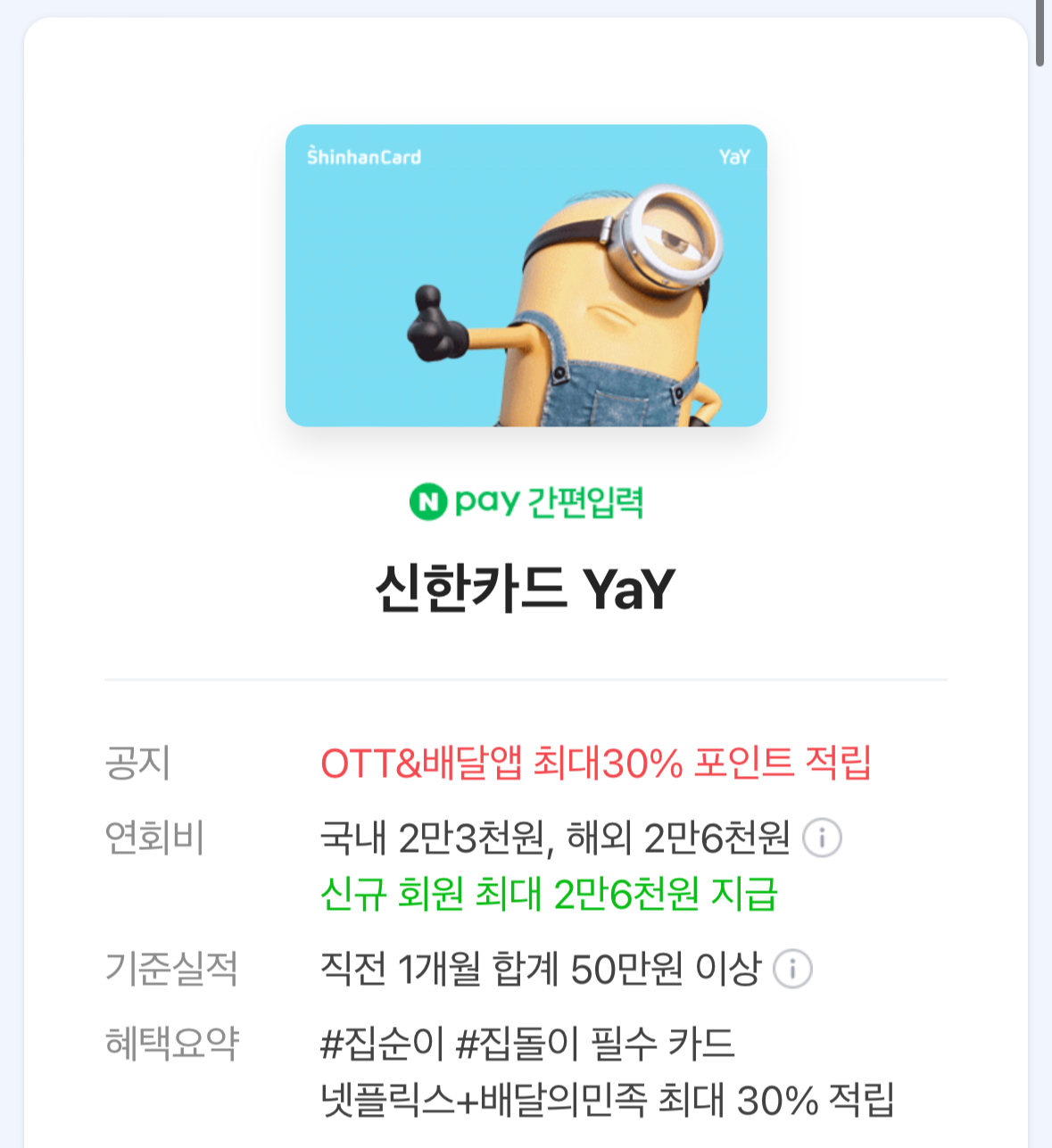 -신한카드 YaY 신규 발급 회원의 경우 카드 사용 등록 월의 익월 말(등록월+1개월)까지는 전월 이용금액 충족여부와 무관하게 서비스 적용